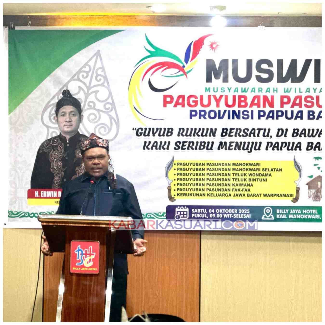 MANOKWARI, Kabarkasuari.com_Menghadiri pembukaan musyawarah wilayah ( muswil) I paguyuban pasunda provinsi Papua Barat, pada Sabtu ( 04/10/2025), Bupati Hermus Indou berpesan agar warga pasunda dapat melestarikan identitas  dan berharap melalui muswil  menghasilkan kepemimpinan yang dapat digunakan percaya, demi kemajuan organisasi.