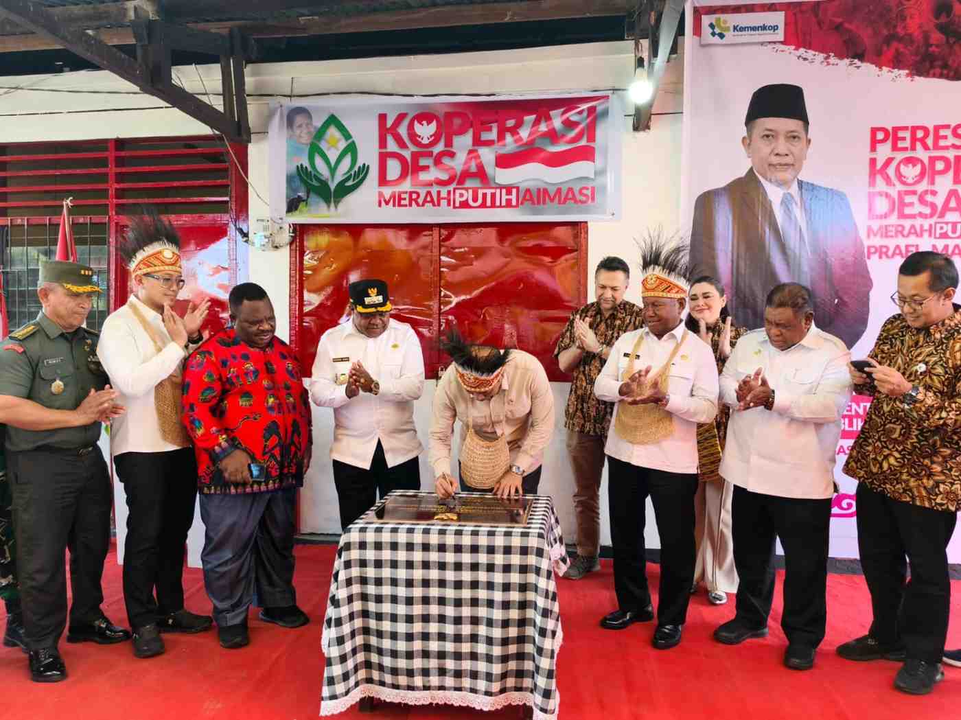 Manokwari,kabarkasuari.com_Wakil Menteri Koperasi Republik Indonesia, Ferry Yuliantono meresmikan koperasi desa merah Putih kampung aimasi, distrik Aimasi, kabupaten Manokwari Papua Barat,Sabtu(28/6/2025). Di dampingi Gubernur Papua Barat, Dominggus Mandacan dan Bupati Manokwari Hermus Indou, di lakukan penandatangan prasasti dan Penyuntingan Pita menandai beroperasi koperasi merah putih di kampung aimasi,